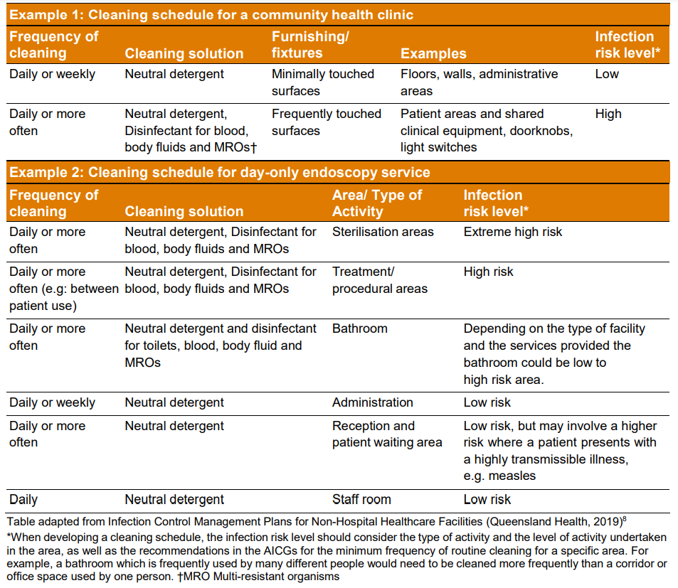 The development of an environmental cleaning program as part of a health related businessā IPC program primarily falls under the responsibility of the business owner. It should be based on the AICG and NSQHS standards, as well as developed in conjunction with the staff tasked to carry out the environmental cleaning. The Commission recommends addressing the following features when developing and implementing an environmental cleaning program: